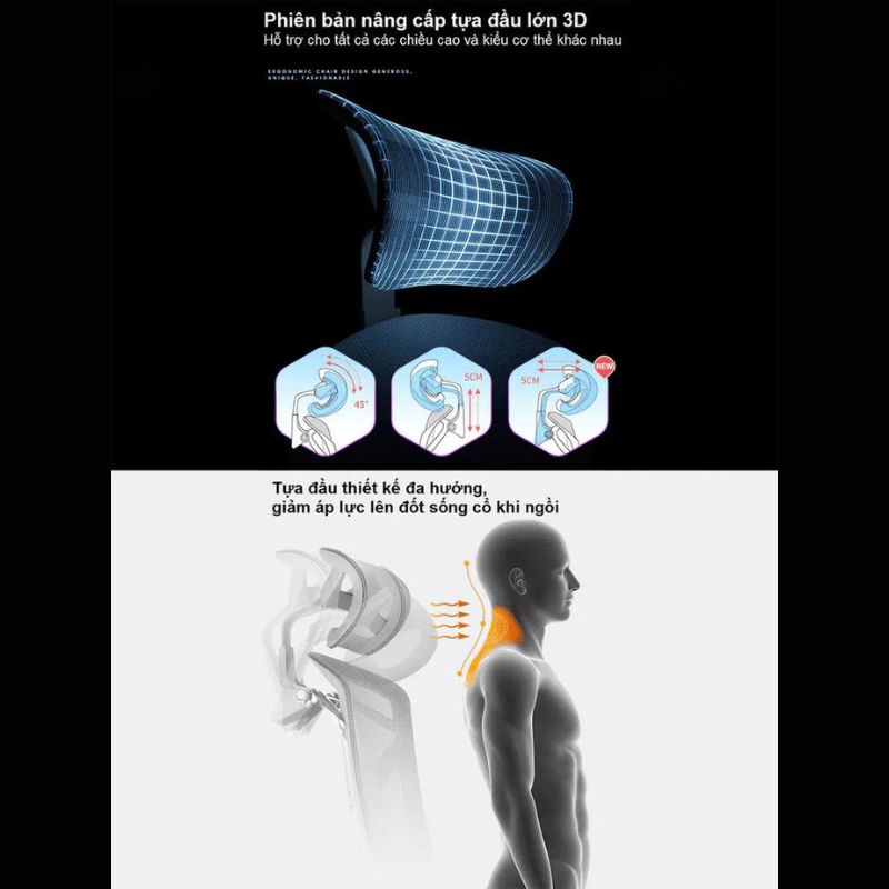 - Vùng tựa đầu 3D giúp ôm phần xương cổ và nâng đỡ được mọi góc độ, cơ chế ngả lưng và phần mầm ngồi 2D giúp hỗ trợ cột sống luôn ôm sát vào vùng tựa lưng từ đó hình thành tư thế ngồi chuẩn y khoa.