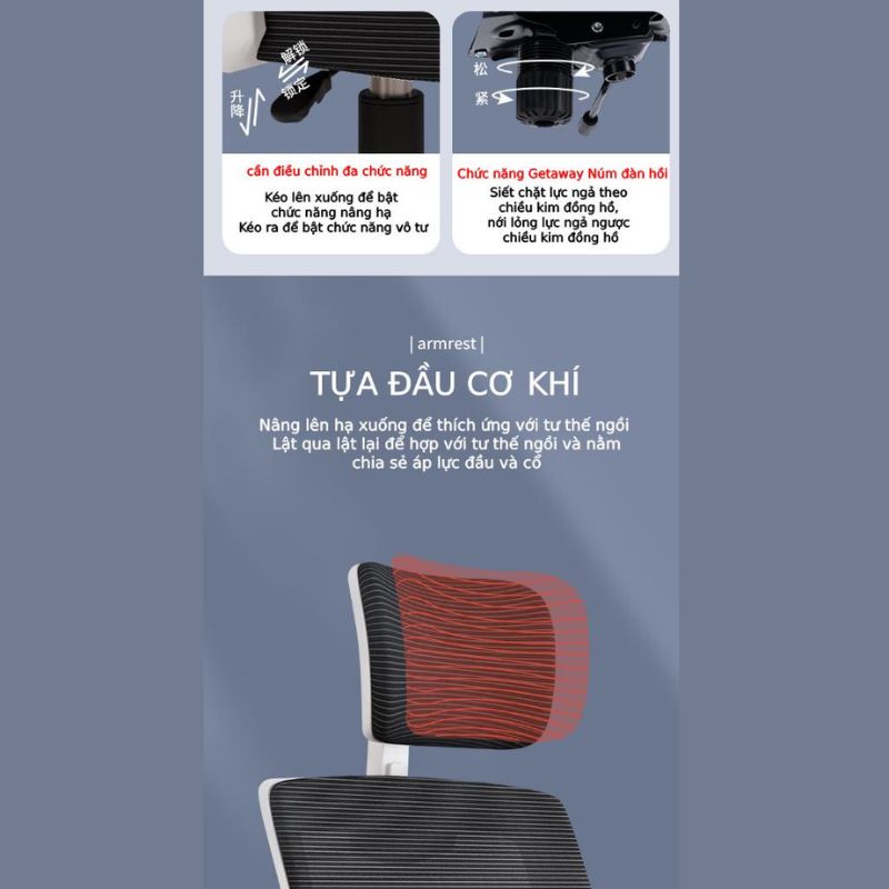 - Dễ dàng thay đổi chiều cao ghế, thay đổi chiều cao, góc nghiêng gối tựa đầu.